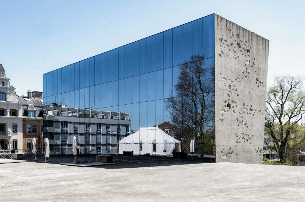 Die kristallin facettierte Erweiterung ist durch eine nordseitige Vollglasfassade ergänzt, welche das bestehende Museum spiegelt und somit alt und neu verbindet. Der flach gedeckte Anbau ragt über den Sockel hinaus, zu dem eine breit gefächerte Freitreppe gehört. Das Volumen des neuen Kubus versucht gegen alle Seiten mit dem Altbau zu interagieren. Das gilt auch für die Materialisierung der Aussenhülle: Für die kunstvoll strukturierte Betonhaut wurde gelblicher Sand verwendet, um dem Anbau eine ähnlich optische Anmutung zu geben wie dem Sockel des Altbaus. Die Betonfassade ist durch ein unregelmässig gesetztes Muster belebt, welches durch pixelartige Vertiefungen auch Licht in das Innere des Baus verteilt. An der südöstlichen Gebäudeecke liegt der einzige von aussen erreichbare öffentliche Eingangsbereich, welcher ins Stadtarchiv führt. Von diesem Bereich aus wird das Gebäude über acht Etagen erschlossen, was von aussen kaum wahrnehmbar ist.