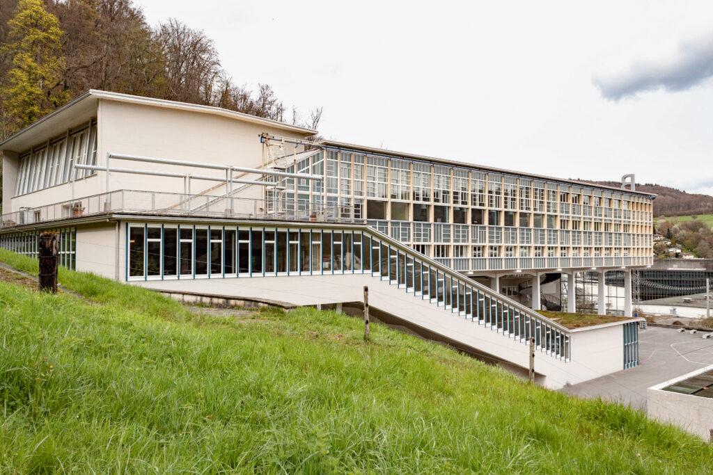 Der zweiteilige, flach gedeckte Bau ist langgestreckt und sechs Geschosse hoch. Zehn Stützen vor den unteren drei Geschossen tragen die Last der drei vorspringenden oberen Geschosse. So entsteht ein überdachter Vorraum, der als Begegnungszone dient. Als Gestaltungsmerkmal nutzt Meili markante Treppen: Eine gedeckte Aussentreppe führt an der Südseite des Gebäudes entlang. Die Last der Treppe wird über zwei V-förmige Stützen abgetragen. Eine freistehende, zentrale Wendeltreppe erschliesst in zwei Umdrehungen das vierte Geschoss. Eine dritte zweiläufige, halb gewendete Treppe im hinteren Bereich der Vorhalle dient ebenfalls der vertikalen Erschliessung. Die tragenden Betonelemente der Vorhangfassade sind nur im Innenraum sichtbar. Davor sind nicht tragende Glaselemente zwischen vertikalen und horizontalen Verstrebungen angebracht. Die Obergeschosse der Südfassade sind in einzelne Quadrate unterteilt, welche entweder mit Klarglas oder mit Ornamentglas gefüllt sind. Die Metallprofile, welche die Quadrate vertikal gliedern, sind gelb gespritzt. Zusätzlich erstrecken sich drei blaue Metallprofile horizontal über die gesamte Südfassade. Ebenfalls blau sind auch die Staketen des Treppengeländers. Die Ostfassade ist vom vierten bis zum sechsten Stockwerk gleich gestaltet. Hier steht unterhalb ein filigraner hoher Windschutz aus Glas. Nach Norden hin finden sich zahlreiche zweiflügelige Fenster, die im Raster angeordnet sind.
