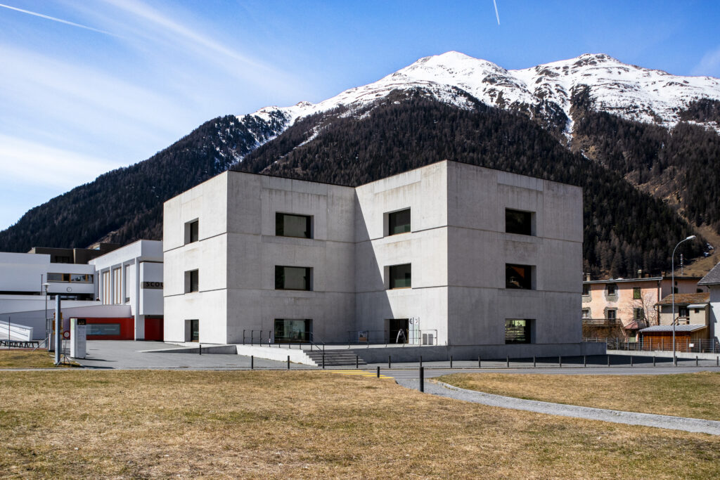 Das Besucherzentrum des Schweizer Nationalparks hebt sich durch seine Form und Materialität deutlich von seiner Umgebung ab. Dennoch fügt es sich durch die gedrungene, kubische Bauweise harmonisch in den Kontext des Ortes ein. Diese Spannung zwischen den historischen Gebäuden und dem modernen Neubau verleiht dem Ensemble eine besondere architektonische Dynamik. Die grossen, bodentiefen Fenster auf allen Seiten des Gebäudes symbolisieren Offenheit gegenüber der Umgebung, dem Dorf und der Landschaft. Valerio Olgiati verfolgt mit diesem Konzept die Idee, eine Ausstellung zu schaffen, die sich nicht von ihrer natürlichen und kulturellen Umgebung abschottet, sondern diese gezielt einbezieht. Architektonisch besticht das Gebäude durch seine Präzision und konzeptionelle Klarheit.