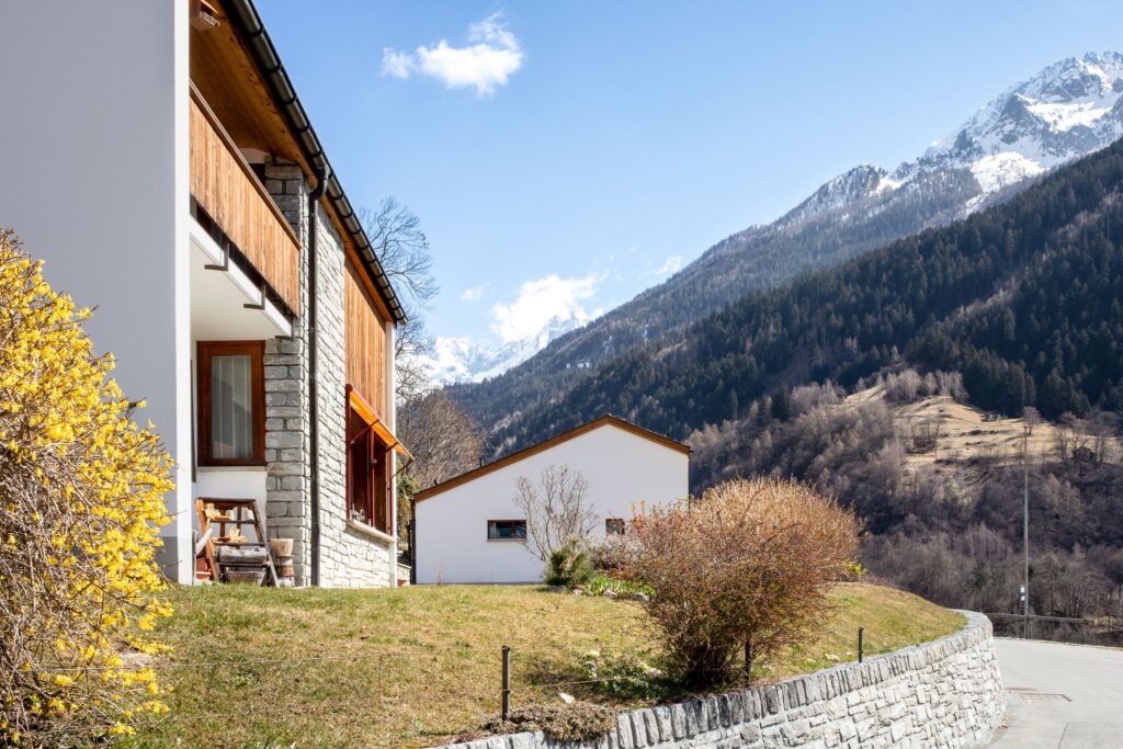 Die Wohnhäuser sind als kleinere Volumen ausgebildet und besitzen zwei Geschosse. Über einen schmalen, mit Gneisplatten ausgelegten Weg gelangt man von der Quartierstrasse zu den einzelnen Häusern. Diese weisen ein asymmetrisches Satteldach auf, welches mit Natursteinplatten eingedeckt ist. Die Grösse, Dimensionierung und Fassadengestaltung der einzelnen Wohnhäuser beruhen auf den Regeln des Goldenen Schnitts. Die Fassade ist durch unterschiedliche Baumaterialien geprägt; in südwestlicher Richtung gibt es in der Mitte ein Natursteinmauerwerk, welches sich in einer L-Form unter dem Wohnzimmerfenster fortsetzt. Oberhalb dieses Fensters ist jeweils eine vertikale Schalung aus Lärchenholz angebracht, als Ergänzung dazu besteht die Balkonbrüstung auf der angrenzenden Obergeschossseite ebenfalls aus einer Lärchenholzschalung. Die Fassade ist durch mehrere, zurückversetzte Elemente gegliedert, wie beispielsweise den Balkon oder den Gartensitzplatz. Dieser ist mit einem Natursteinmauerwerk und einer Holzverschalung eingefasst und öffnet sich nach Südwesten mit einem Holzblendwerk. Auf der Rückseite des Gebäudes befindet sich der gedeckte Eingang, gefasst von vertikaler Holzschalung und Natursteinmauerwerk.