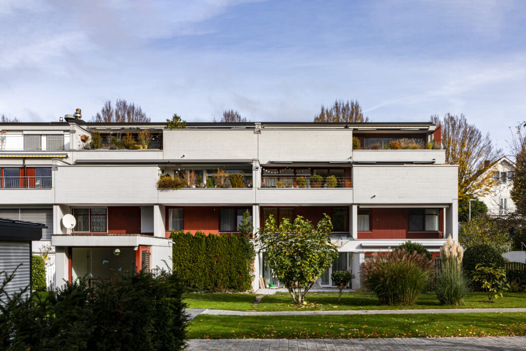 Trotz ihrer Ähnlichkeit sind die fünf Mehrfamilienhäuser nicht identisch, sondern an die örtlichen Gegebenheiten angepasst. Die südöstlichen und nordöstlichen Eckgebäude beispielsweise nehmen den Schwung des Strassenverlaufs auf und verspringen in der Mittelachse um vier Meter, während die Nachbarhäuser parallel zur Strasse liegen. Alle Gebäude verfügen über ein zurückgesetztes Zugangsgeschoss mit einem überdachten Eingangsbereich. Die Südwestseiten der Gebäude sind abgetreppt, wodurch die oberen Geschosse vorgelagerte Freiterrassen erhalten. Wandscheiben zwischen den Terrassen und Balkonen gewährleisten die nötige Privatheit. Integrierte Pflanztröge bieten Sichtschutz, stärken aber auch die Verbindung zu den Gemeinschaftsflächen. Während fast alle Gebäude durch Sichtbetonfassaden mit einer horizontalen Schalungsstruktur geprägt sind, besitzt das südwestliche Eckgebäude eine verputzte Dämmfassade. Die Dämmplatten, deren Befestigungsdübel und Fugen nach 50 Jahren ein neues Muster erzeugen, kontrastieren mit der ursprünglichen Gestaltung der anderen Baukörper. Diese wiederum sind in hellem Grau gestrichen, mit sichtbaren Fugen, welche die Konstruktionselemente ablesbar machen. Wiederkehrende rote Akzente, wie Fensterrahmen, setzen Kontraste zu den grauen Fassaden und kennzeichnen die Wohnbereiche. Gemeinschaftliche Zonen wie Treppenhäuser sind in einem dunkelbraunen Farbton mit auberginefarbenem Stich gehalten, der auch in den Spenglerarbeiten wiederkehrt.